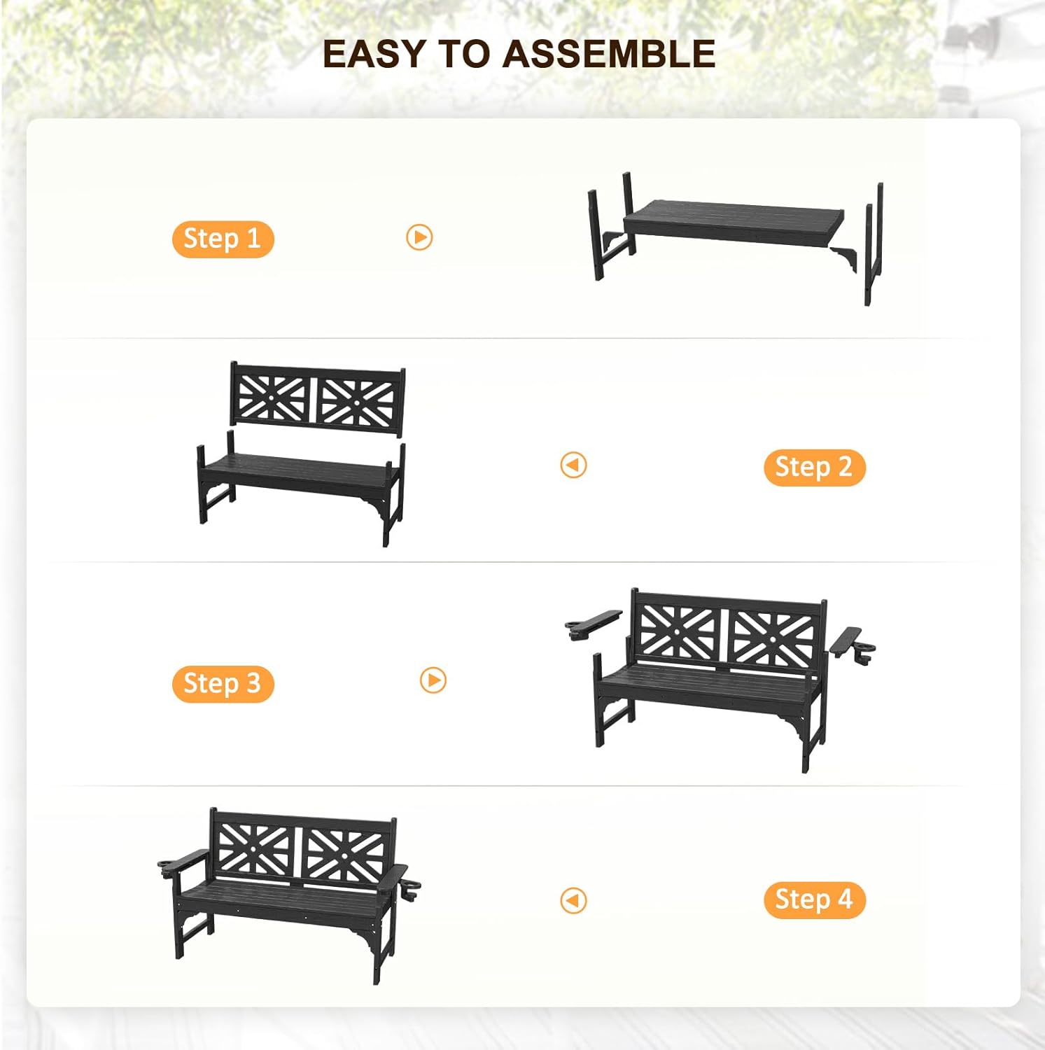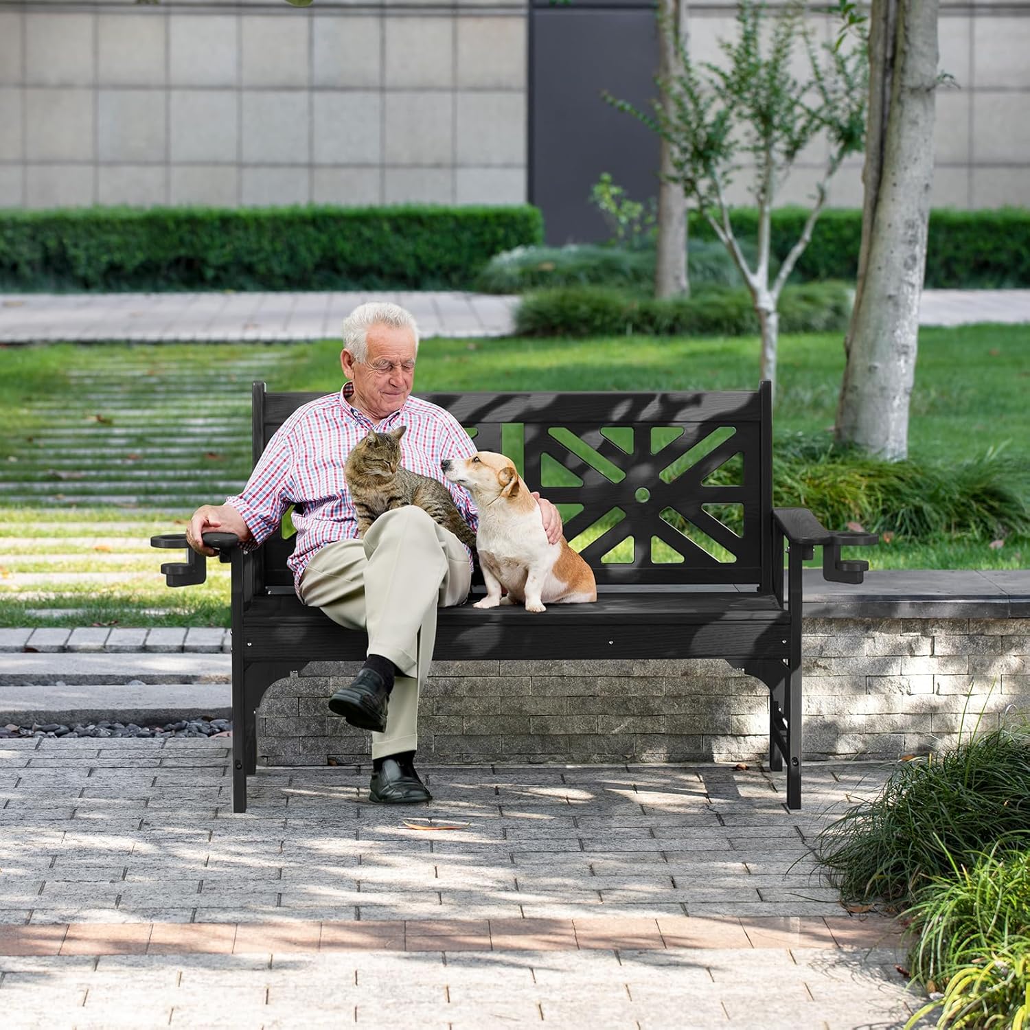 nalone Outdoor Bench with Cup Holders, HDPE All Weather Porch Bench Load up to 800 Lbs, 2-Person Garden Benches Rot-Proof Fade Proof for Patio, Porch, and Park (Black)