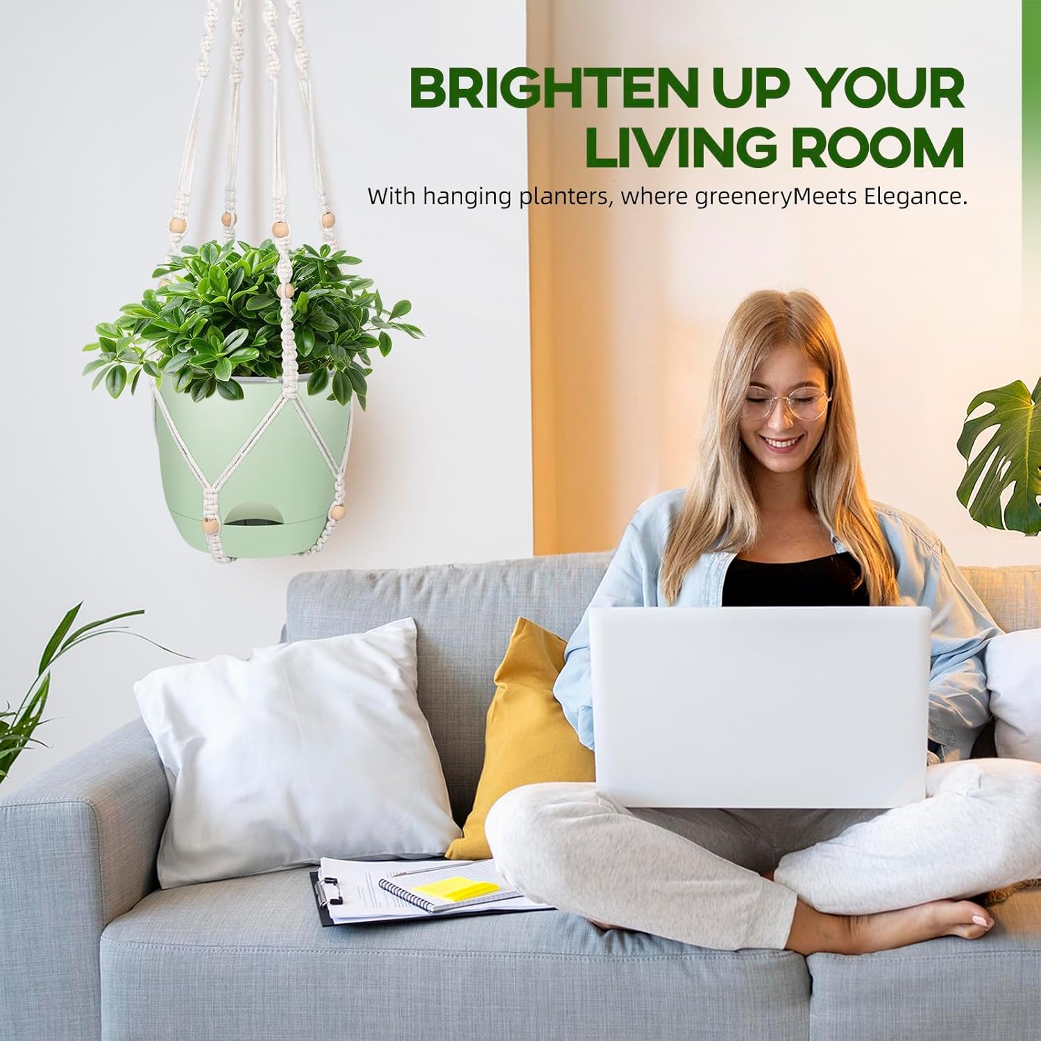 2-Pack 5.7-Inch Self-Watering Hanging Planters for Indoor & Outdoor Plants,34Inch Macrame Hanger Plant Pots Indoor with Drainage,Small Hanging Planters & Baskets,With Two Sets of Hooks(Pure green)