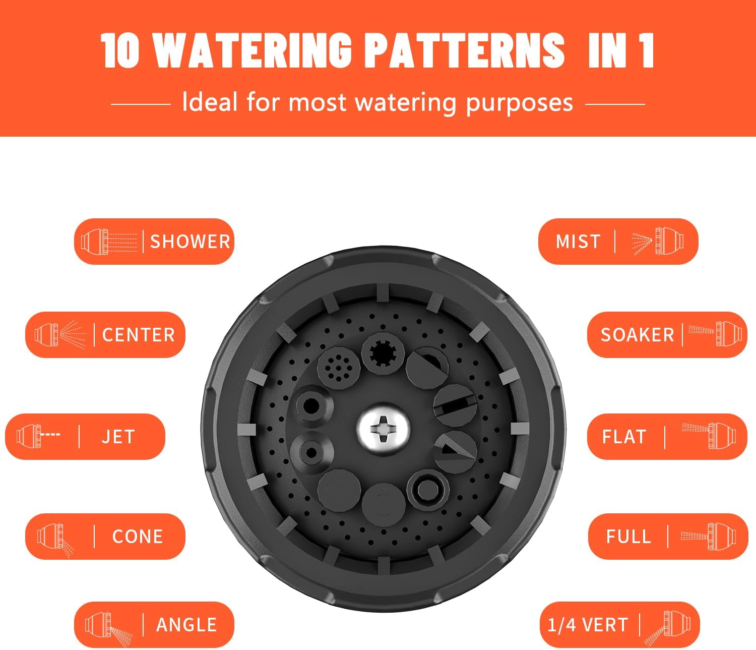 - 10-VERSATILE SPRAY PATTERNS: Precisely engineered to offer ten distinct spray functions: Full/Center/Jet Mist/Shower Soaker/Cone Angle/Flat ΒΌ Vertical Easily switch between patterns to handle everything from delicate seedlings to heavy-duty cleaning.