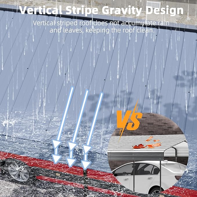 - GRAVITY STRIPE DESIGN: RUQARHY has improved and upgraded the common horizontal stripe carport in the market, the roof adopts vertical stripes with inclined grooves, the rain and snow will not pile up on the roof, it will flow down naturally with the gravity, which strengthens the ability to face the severe weather such as torrential rain and blizzard.