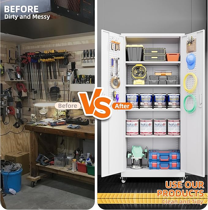 - Rotating Casters: The garage storage cabinet has 4 detachable rubber casters, easy to move, can be locked. It is equipped with four bottom corner protection devices to ensure maximum safety. We use heavy-duty rubber wheels to provide comprehensive protection for all surfaces (hardwood, laminate, tile, carpet, etc.). It will not be scratched, but it is easy to move. If it needs to be replaced, the casters can be removed.