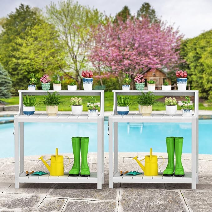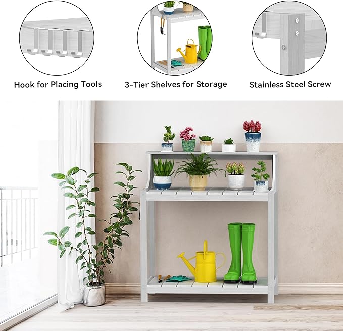 - 【Smart Storage & Organization】Featuring a spacious 3-tier open shelving design and 4 convenient side hooks, this outdoor potting table offers ample storage for all your gardening essentials. Easily organize and access pots, soil, tools, and accessories. Keep your workspace tidy and efficient, with everything you need right at your fingertips.