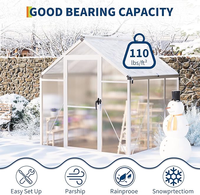 - 【Study Build】Crafted to handle various weather conditions, this greenhouse uses 720g/m² polycarbonate panels and a robust aluminum frame for enhanced durability. The strong structure offers reliable performance in heavy rain and strong wind, helping to maintain a safe environment for your plants in different seasons