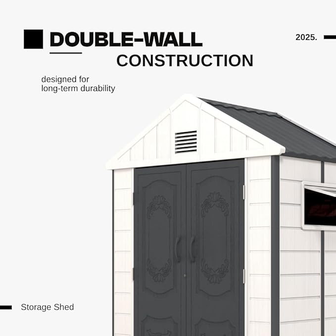 - 【Double-Wall Construction】The steel-reinforced dual-wall and impact-resistant floor are designed for long-term durability, providing resistance against insects, corrosion, and improved waterproofing. (Maximum wind resistance grade: 6 (24-30 mph); Maximum snow thickness tolerance: 6 inches.)