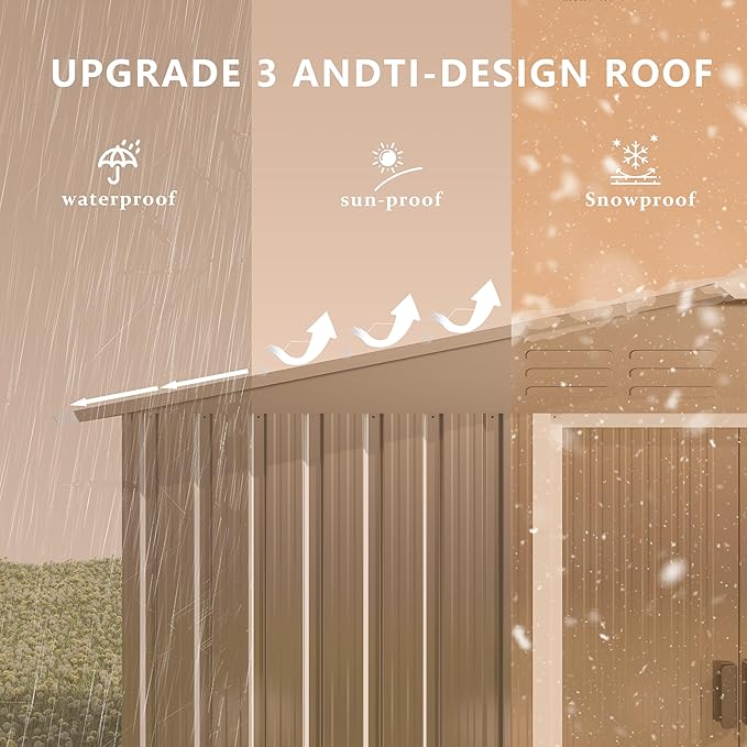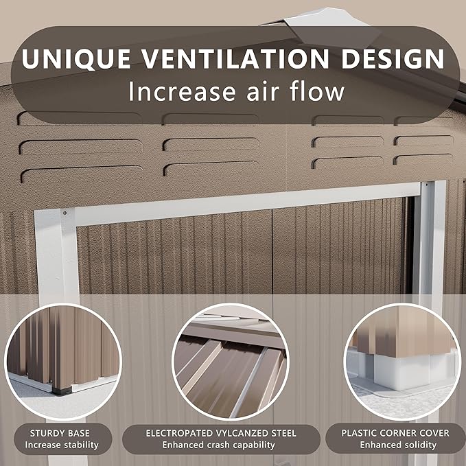 - Durable and practical: The metal storage shed is constructed of galvanized steel, with a sturdy overall structure. The exterior of the shed with sliding doors and ventilation openings is painted to prevent ultraviolet radiation. The sloping roof and arched aluminum panels enhance waterproofing performance.