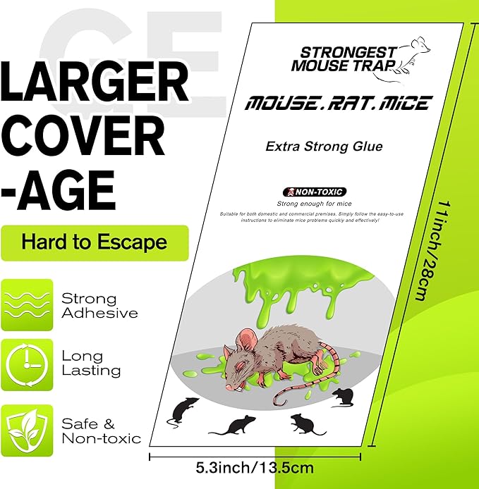 - [Huge Sticky Trap Nowhere to Run]Each mouse glue traps measures 11 x 5.3 inches/ 28 x 13.5 cm, larger than standard traps covering more area to catch more rodents in one go. The extended surface increases the catch rate and reduces escape chances