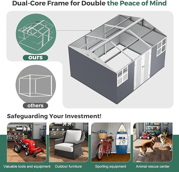 - 💪 INDUSTRIAL-GRADE REINFORCED FRAME: Built to endure. Unlike flimsy alternatives, our shed's skeleton is crafted from 0.6 mm-thick(22 gauge), heavy-duty galvanized steel. The structure is significantly enhanced with an apex-braced roof system and reinforced wall columns. This robust engineering provides exceptional stability against warping and sagging, creating a secure fortress for your valuable lawn mower, bikes, and tools.