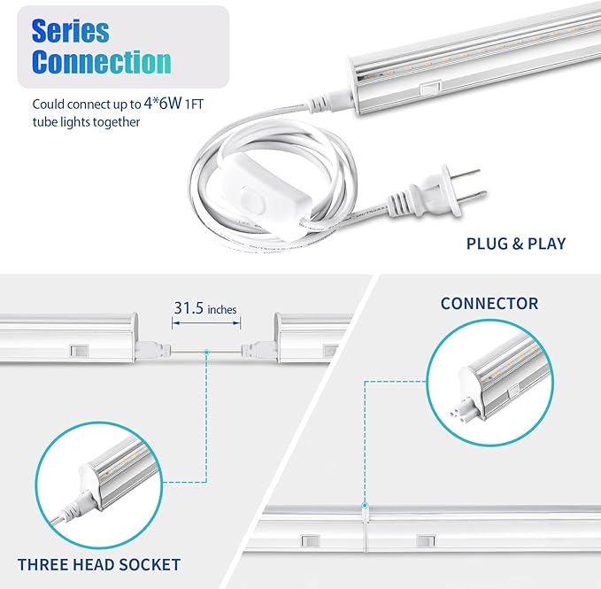 - What you get: 4 x T5 grow lights, 1 x US ETL certified power cord with switch (59 inches), 3 x connecting wires (31.5 inches), 4 x accessory bags, 8 x hanging rings, 8 x screws, 9 x cable ties, 1 x Velcro cable tie (78 inches), 1 x instruction manual.