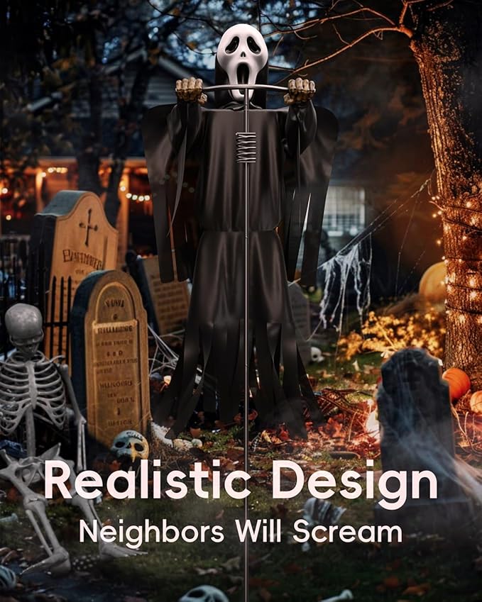- Heart-Stopping Realism: Feel the chill! A top-mounted spring ensures eerily lifelike swinging and swaying in the breeze, mimicking a real ghost drifts and dances eerily with every breeze, its flowing cloak and spectral mask creating a true horror scene, making visitors jump with its realistic