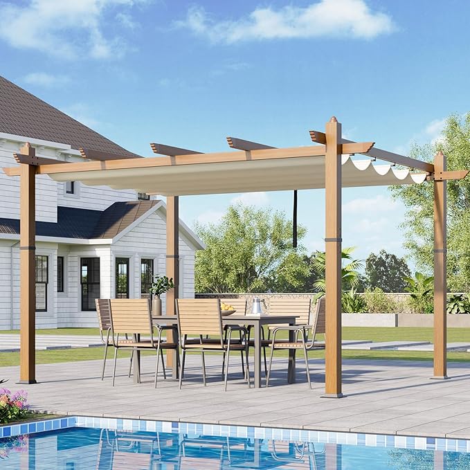 10x13 Ft Outdoor Retractable Pergola with Adjustable Roof Modern Metal Patio Gazebo, Upgraded Faux Wood Grain Aluminum Pergola for Deck, Backyard Gardens, Porches, Grapevines, Beige
