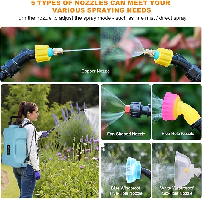 - 【Multi-Spray Electric Sprayer】Effortlessly switch between fine mist (gentle watering), straight jet (targeted cleaning), and wide fan spray (broad coverage) using the interchangeable brass nozzles. Customize the spray pattern for precision tasks in lawn and garden applications.