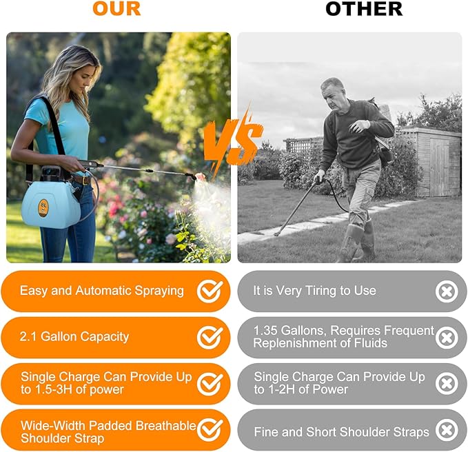 - Lightweight & Ergonomic Design: 2.1-gallon portable water sprayer with wide opening (Quick filling, easy solution mixing and rinsing), transparent scale tank (water level is visible in real time), adjustable shoulder strap, ergonomic handle, and 3.6-foot hose. Garden sprayers can be quickly installed within a few minutes and is easy to clean. Whether you are an gardener or a beginner, weed sprayer pump is a multi-functional and reliable tool that meets all your gardening and home needs.