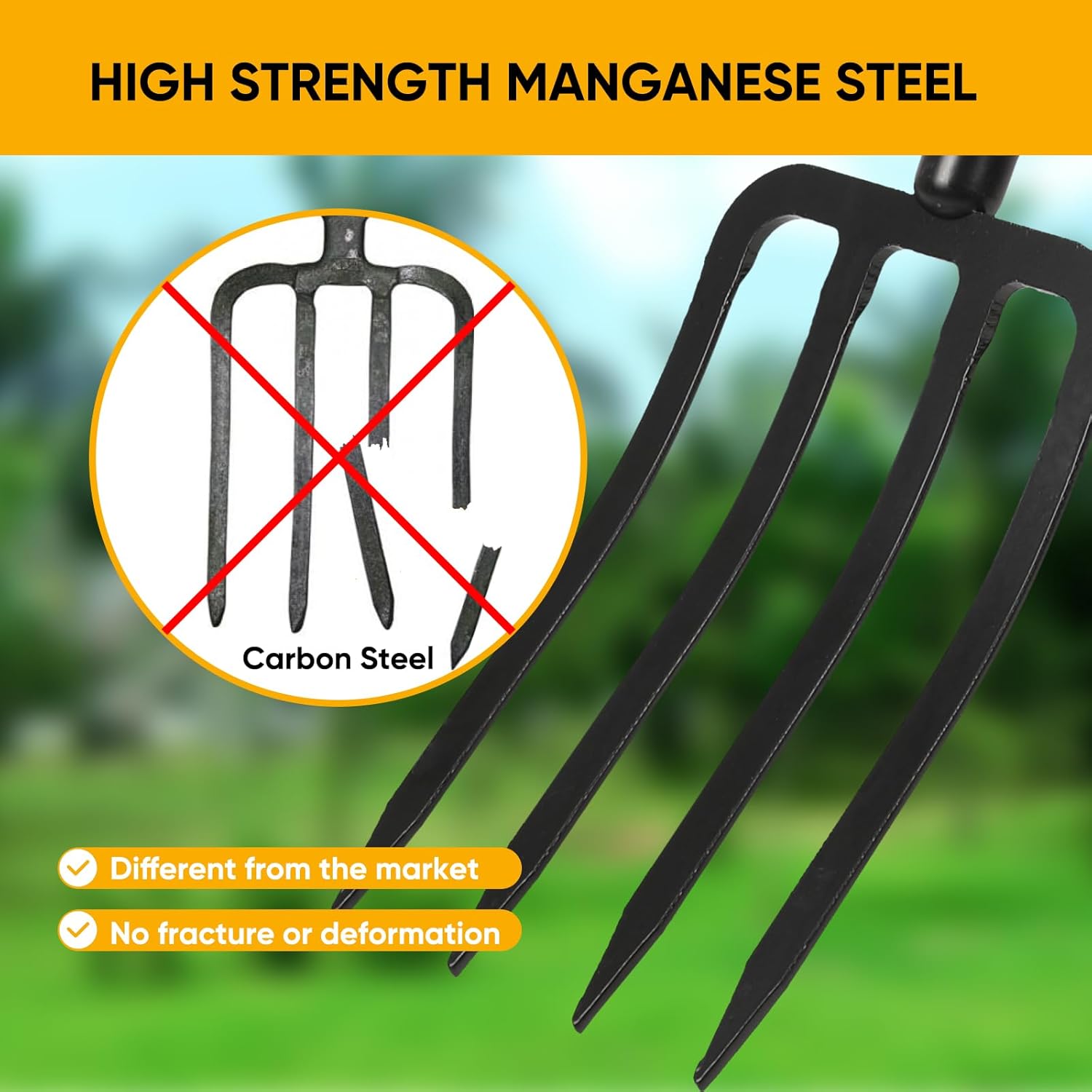 Garden Fork with Ergonomic Handle, Fiberglass Handle,4-Tine Pitchforks for Gardening Digging Composting Spading.
