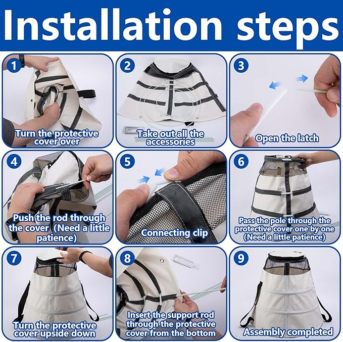 - Easy Setup: The upgraded support structure allows for simple assembly. It includes 3 circular ring supports and side supports, ensuring stability for years of reuse. You can refer to the picture for detailed installation steps