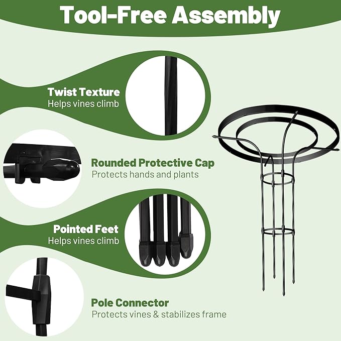 - Tool-Free Assembly - This mushroom-top round trellis comes with a manual for quick and hassle-free setup. No screws or special tools needed, just snap the parts together in minutes. Perfect for DIY gardeners and a smart upgrade from traditional tomato cages or bean trellises.