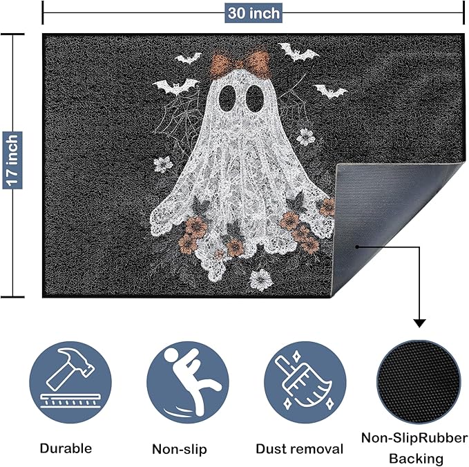 Halloween Ghost Door Mat, Vintage Halloween Ghost Spider Web Bats Doormat Non-Slip for Front Door Porch Indoor Outside Entrance Entryway, Gothic Witchy Floral Welcome Mat, 17x30 Inch
