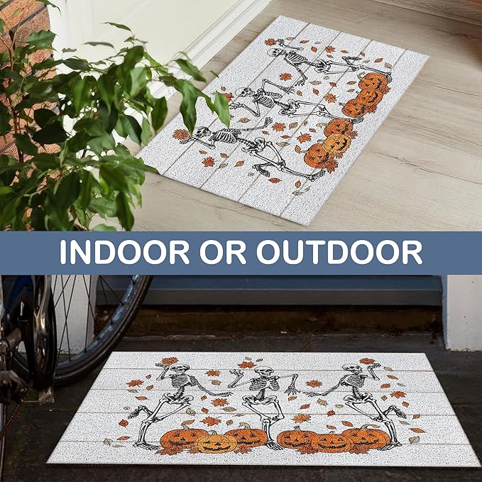 Gothic Halloween Skull Door Mat, Fall Maple Leaf Halloween Pumpkin Doormat Non-Slip for Front Door Porch Indoor Outside Entrance Entryway, Funny Spooky Gothic Welcome Mat, 17x30 Inch