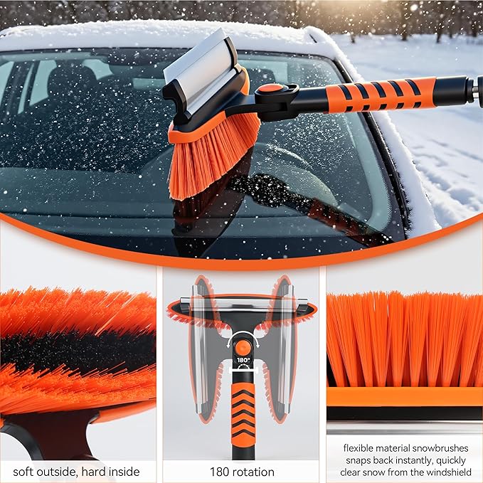 - 【Efficient Snow & Ice Removal】: High-quality ABS shaft, EVA cotton handle and Double-layer PC bristles. Soft bristles on the outer circle can remove most of the accumulated snow, Hard bristles on the inner circle, remove the remaining hard snow chunks. Ensuring that the Snow Brush comes Into Contact with the Vehicle Surface without Causing Any Scratches or Wear. and the handle is soft and non slip.