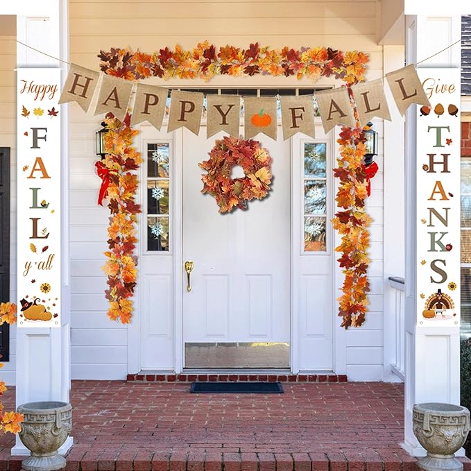 - 【2025 Newest Artificial Maple Leaf Garlands Fall Decorations Set for Home】This Hanging Fall Maple Leaf Vine Garland upgraded with 5 pack maple leaf garlands with 6 different colors leaves, each artificial maple leaves autumn garland is 6FT, total 30FT, enough long and enough lush fall leaves garland to meet all your fall decor needs.Happy Fall Porch Banner Welcome Signs. Burlap Banner and Thanksgiving Artificial Pumpkins Home Decoration Set to decor with a wonderful Fall Decorations for Home.