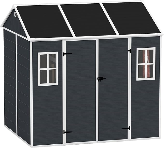 Resin Storage Shed 8x7ft, Large Tool Shed with Floor, Two-Window, Lockable Doors and Vents, 12mm Thick pp Board, Outdoor Storage Sheds for Patio, Garden, Backyard, Lawn (Dark Gray, 8 * 7ft)