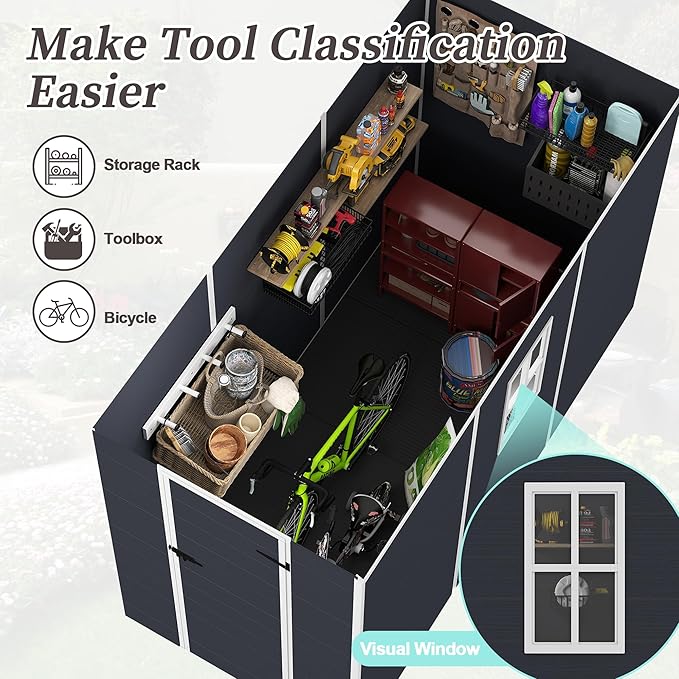 - [Multifunctional Outside Sheds ] The design of the sloping roof can effectively prevent rainwater accumulation, and the lockable door design can protect your property safety and prevent accidental entry of some small animals. This shed also features ventilation panels to ensure proper air circulation, preventing musty odors and mildew growth. A built-in window allows light to enter, creating a pleasant, well-lit atmosphere.