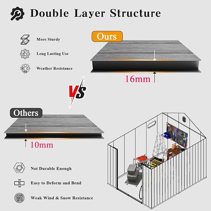 - Durable All-Weather Resin Shed - Constructed with premium double-walled resin panels, this garden shed outperforms metal and wood alternatives. It's UV-resistant, won't rust or rot, and withstands extreme temperatures without warping or cracking - built to last through decades of use.