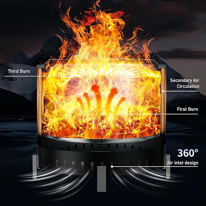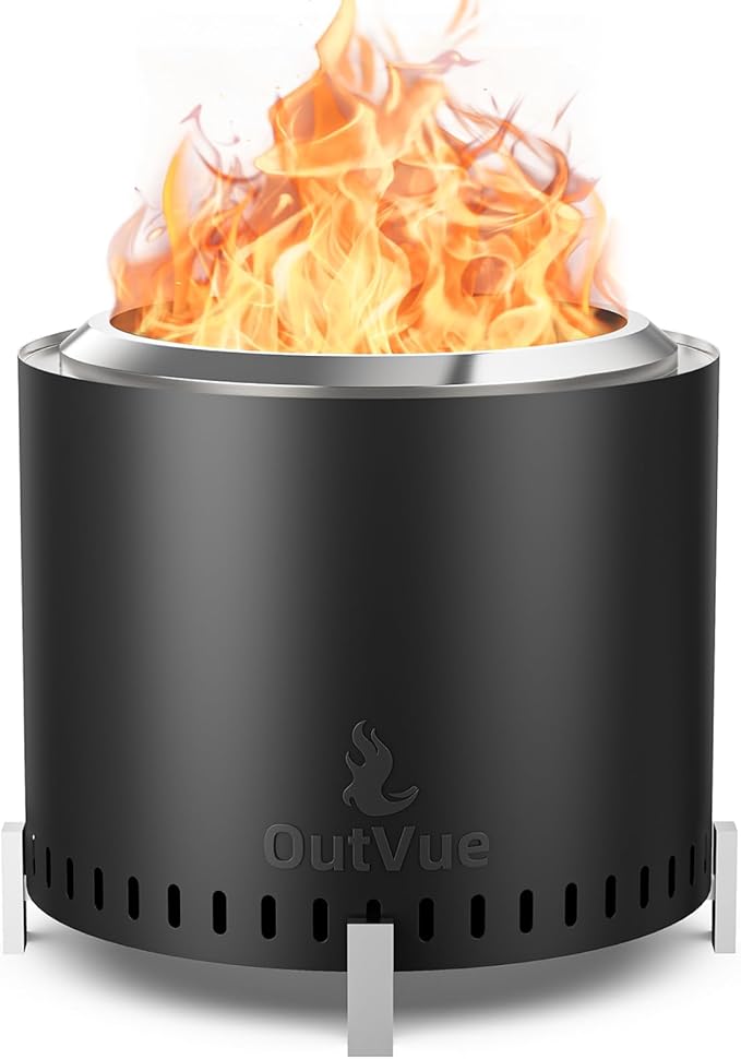 - [Low Smoke Design]: OutVue smokeless fire pit has unique design and scientific internal airflow system, provides you with a clean flame atmosphere. No more sting the eyes smoke, no more suffocating air - just the enough warmth and ambiance of low smoke fire pit. We send a waterproof cover[can used as a Tote Bag] and a poker to you for using the low smoke fire pit more convenient.