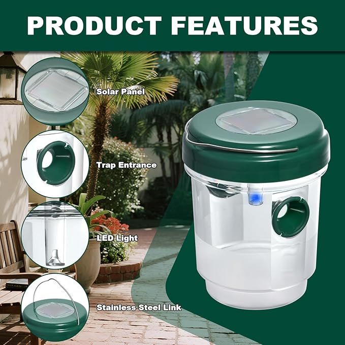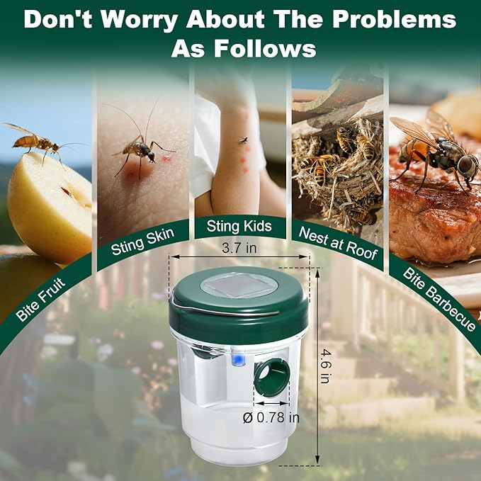 - Solar-Powered LED Light: Our wasp killers are equipped with a solar panel on top that automatically charges by day and activates light at night to effectively attract wasps, yellow jackets, hornets, etc. Just flip the switch, the LED light will automatically turn on at night and turn off during the day