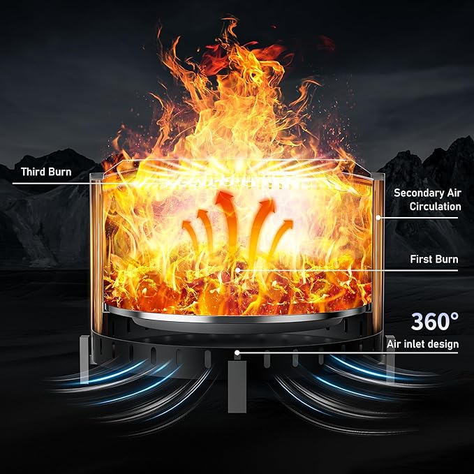- [Low Smoke Design]: OutVue smokeless fire pit has unique design and scientific internal airflow system, provides you with a clean flame atmosphere. No more sting the eyes smoke, no more suffocating air - just the enough warmth and ambiance of low smoke fire pit. We send a waterproof cover and a poker to you for using the low smoke fire pit more convenient.