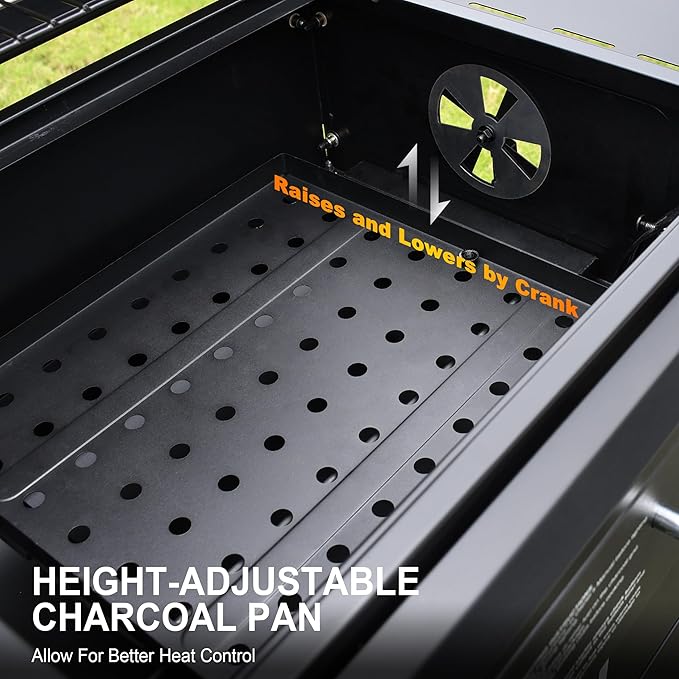 - OPTIMIZED AIRFLOW: Our grill's side damper ensure excellent airflow, reducing heat loss and giving you control over the flame. Adjust the charcoal pan height for perfect heat distribution and grilling results every time