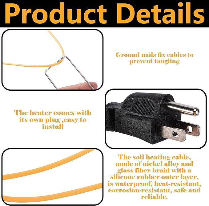 - Heating Cable Set:You will receive a total of 59 feet soil heating cable and 20 ground stakes to secure the cable in place, making installation and use convenient. The package includes detailed usage instructions and precautions; please read them carefully to ensure safe use.