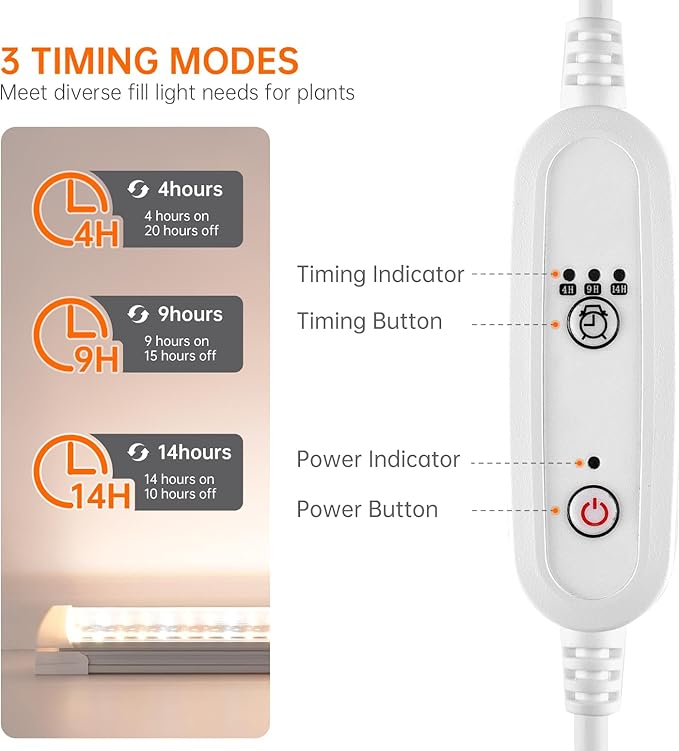 - Convenient Timer Function - The led grow lights for indoor plants features a timer function that allows you to easily set the grow light strip to automatically turn on and off at your chosen intervals (4, 9, or 14 hours). This ensures your plants receive ideal lighting even when you are on vacation or busy with work, providing automatic care every day