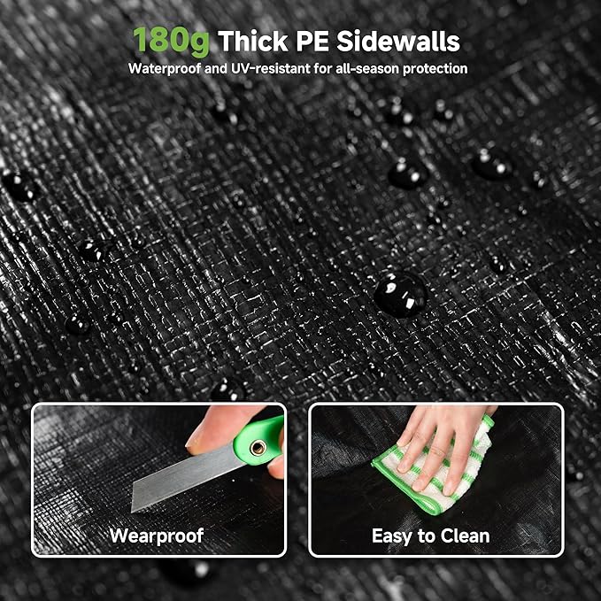 - 180g Removable PE Sidewalls : Offering excellent waterproof, dust-proof, and UV-resistant properties. The detachable design allows for easy installation or removal based on your needs, providing flexibility for different seasons and usage scenarios.