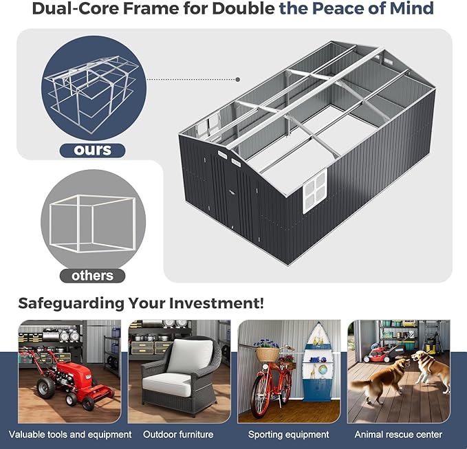 - 💪 FORTRESS-LIKE HEAVY-DUTY STEEL FRAME: Go beyond standard storage with a structure built for endurance. The backbone of this shed is an ultra-sturdy 0.6mm thick (22ga)galvanized steel frame, reinforced with an apex roof design that provides superior strength against sagging and warping. This robust framework creates an unwavering fortress for your most valuable assets, from heavy ride-on mowers and motorcycles to a full collection of tools and equipment.