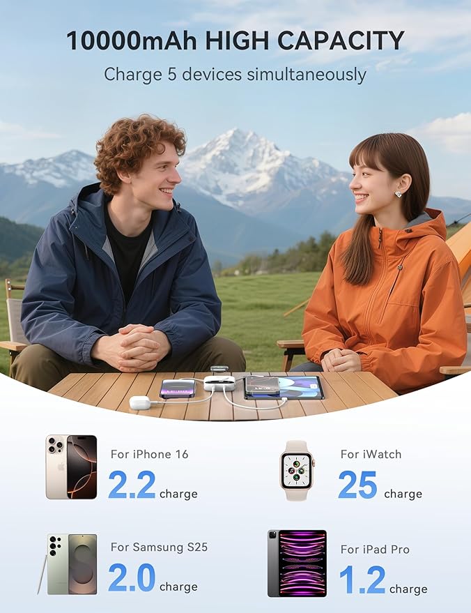 - γπππππ-ππ π πππππ + π πππππ + π’πππππ ππππππππγβΈAttached with iOS and type-C cables mean you're never hunting for cords, pair them with 2 USB ports make the external battery to juice 5 devices simultaneouslyβYour iWatch, phones, tablets, earbuds, or cameras. A perfectly aligned 3.5W magnetic puck snaps iWatch Series 10/9/8/7/6/SE/5/4/3 & Ultra/Ultra 2 in place and delivers about 25 full charges on a single bank cycle