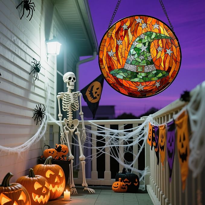 Stained Glass Window Hanging - Halloween Decorations Witch Hat Suncatcher for Doors Garden Indoor Spooky Funny Green Sun Catchers Gothic Decor Horror Gifts for Women Men Friend 11.8 in