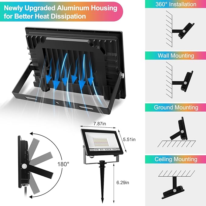 - Color Changing Flood Light: We provide 2 control options for this 600W comparable LED floodlight: remote control and app control. In addition to providing 16 million colors for DIY projects, LED color-changing floodlights for outdoor use also come with microphone, scene, and music sync dynamic modes. Both time and electricity are conserved by the practical and reliable timer and memory features. Never idle, this 6500K white light is very bright and suitable for daily illumination