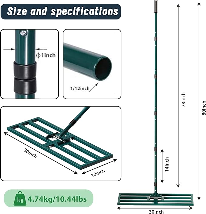 - Flexible Adaptation to Various Lawn Needs: This leveling rake contact size at the bottom is designed to be 30" x 10", which is convenient to move and provides powerful mobility to meet the needs of different-sized areas. No matter how large or small your lawn is, the Beeowner lawn leveling rake can provide the perfect solution.