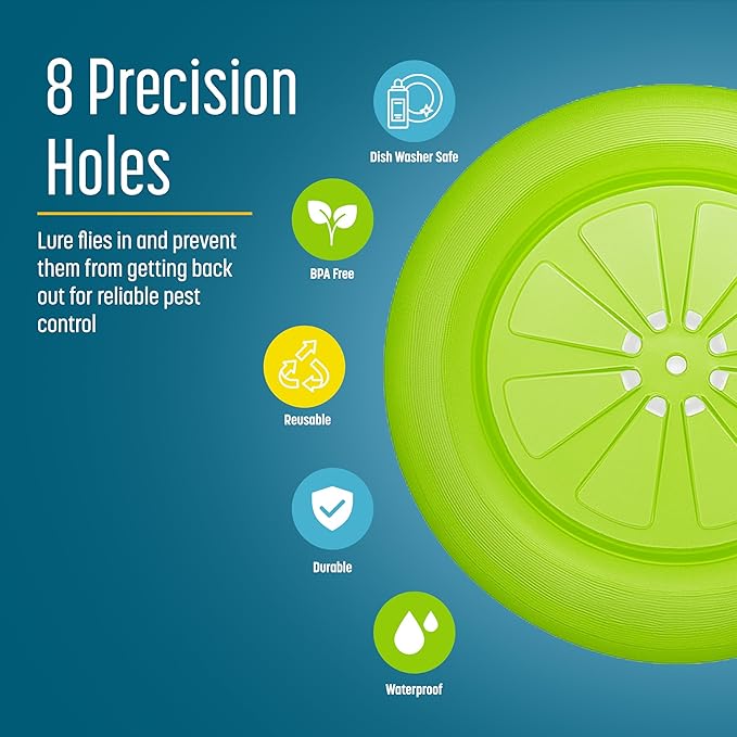 - Each reusable cap features 7 precision entry holes that lure flies in and prevents them from getting back out for reliable, chemical-free pest control.