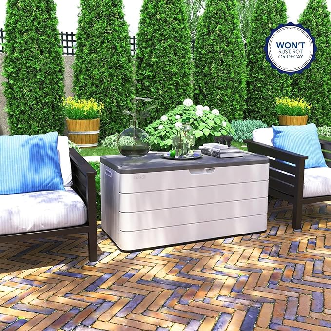 - 【100 Gallon Large Capacity】 Spacious 100 GAL interior stores patio cushions, garden tools, pool floats, and outdoor toys. Doubles as a storage ottoman, side table, or bench for deck, patio, and backyard spaces.