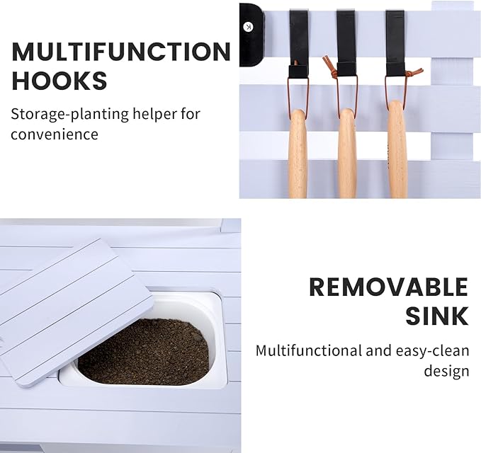- EXTRA STORAGE SPACE: Our garden workbench offers a variety of storage space. There is a large shelf underneath that works well for storing soil bags. Hooks keep gardening tools close at hand and provide a space for gloves, and drawers keep you out of the wind and rain. Plants can be grown directly on it.