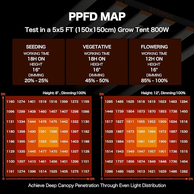 - 【Adaptive Coverage with Expandable Design】 Revolutionize your grow space! ECOHOM's LED grow light dynamically adjusts coverage from 5x2.5ft (seedling focus) to 5x5ft (full bloom), perfectly adapting to your plants' growth stages. Achieve uniform canopy penetration from seedling to bloom, eliminating dark corners with optimized edge-to-edge illumination – ideal for tight spaces like 200x200x220cm grow tents.