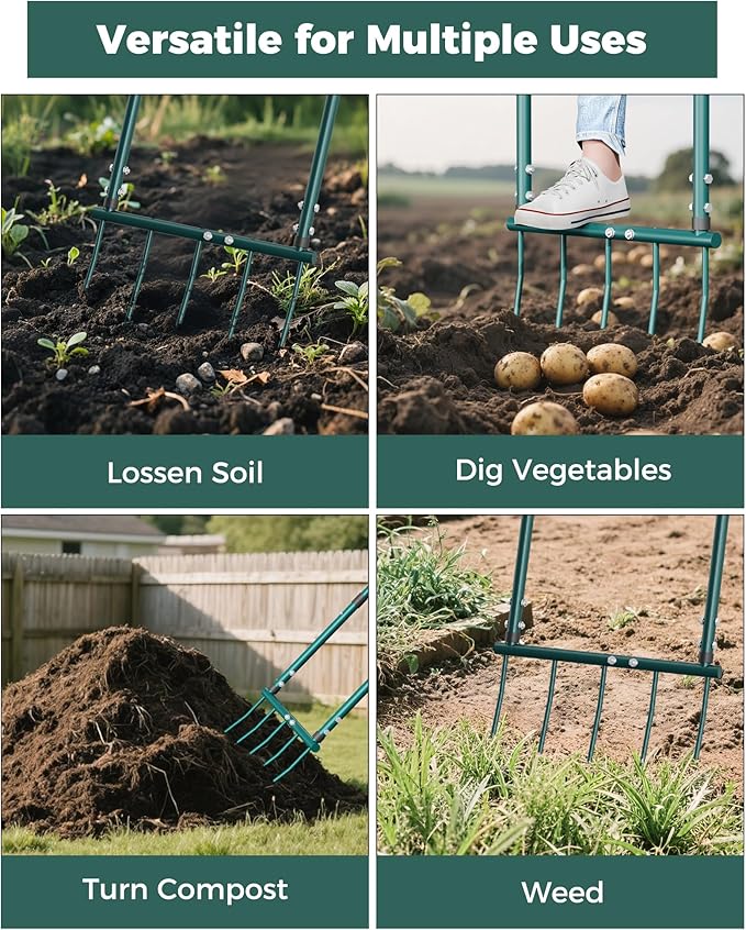 - Multi-Purpose & Safe: Ideal as a mulch fork or pitchforks for gardening, but avoid extreme conditions like rocky terrain. Disassembles for compact storage. Keep sharp tines away from children