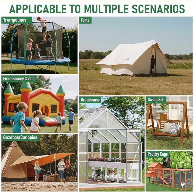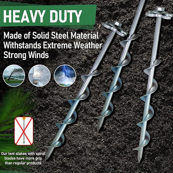 - Enhanced Spiral Blade Grip: Upgraded spiral earth anchors designed a larger friction area for improved stability and wind resistance. Perfect for camping tent stakes, canopy anchors, trampoline anchors, swing set anchors, and other outdoor structures