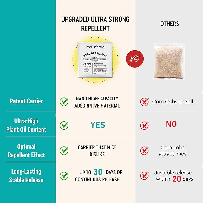 - Easy to Use & Mess-Free Solution - Simply place the mice repellent pouches in rodent-prone areas—no traps, no dead rodents to clean up. Perfect for indoor spaces like closets and cabinets, or outdoor areas like garages and RVs.