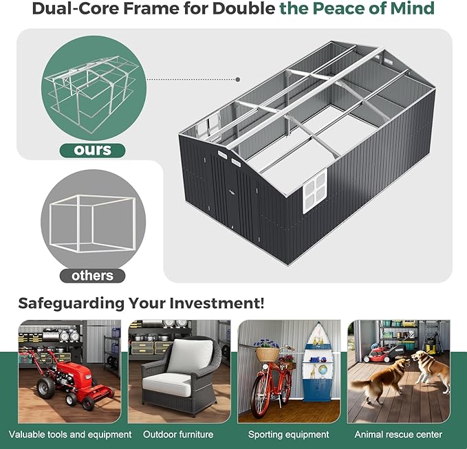 - 💪 UNMATCHED STRUCTURAL INTEGRITY: Built on a foundation of pure strength, this shed’s core is an exceptionally robust 0.6mm (22-gauge) galvanized steel frame. The apex roof is engineered for maximum structural rigidity, preventing sagging and ensuring long-term stability. This powerful framework provides a secure haven for your most significant investments, from garden tractors and ATVs to extensive tool collections.