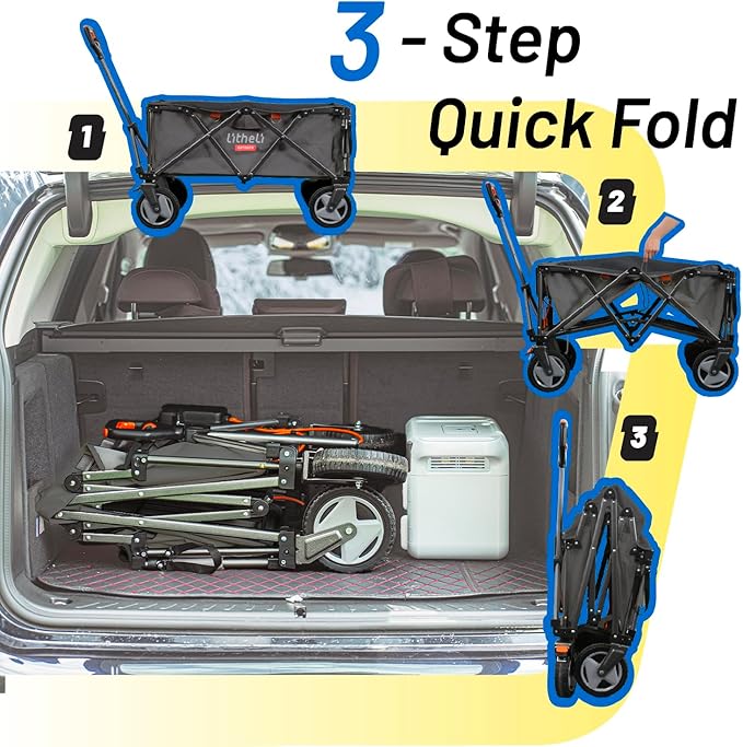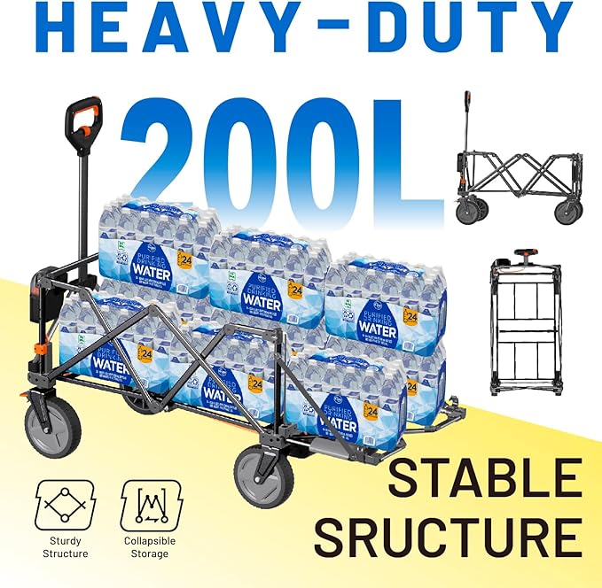 - 【Massive Storage – Haul Everything You Need】 Boasting a 200L capacity and a reinforced tailgate, this utility cart fits tents, fishing rods, groceries, or picnic supplies with ease. It supports up to 300 lbs—ideal for family outings, garden tools, or shopping hauls. Bring more, carry less effort.