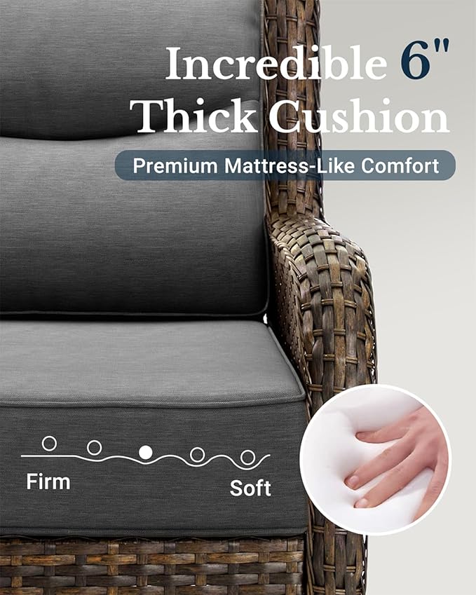 - 6-Inch Thick Seat Cushion: Unlike the 4" cushions most outdoor sets use, our 6-inch cushions with high-density 28D foam offer the ideal balance of softness and support. Quick-rebound core keeps its shape, while added cotton layers and 3D backrest fill deliver extra comfort and pressure relief (Note: Ottoman cushion is 3.5")