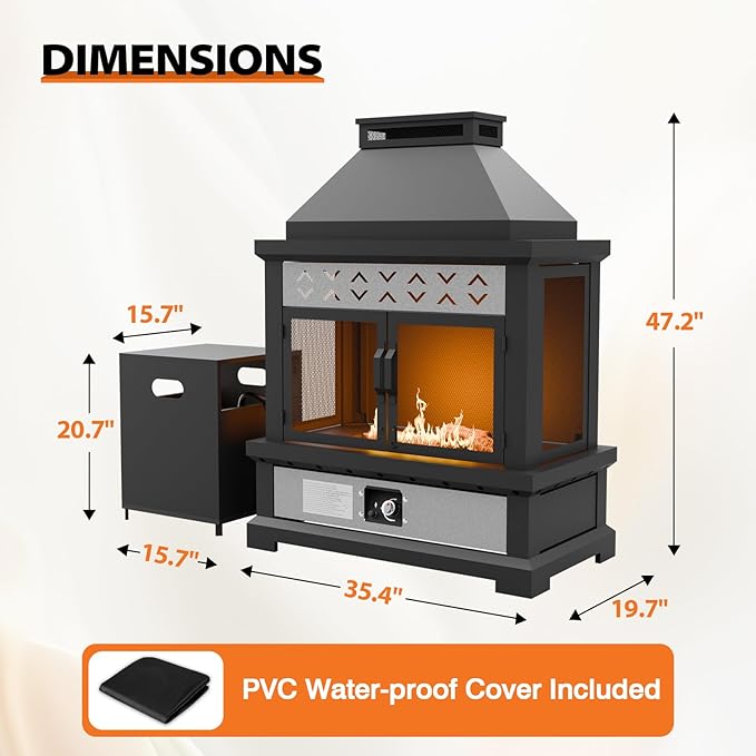 - INCLUDES DUST COVER: Extend the life of your fireplace with the included dustproof, weather-resistant cover. Helps protect against dirt and moisture when not in use. For easy setup, we recommend two or more people