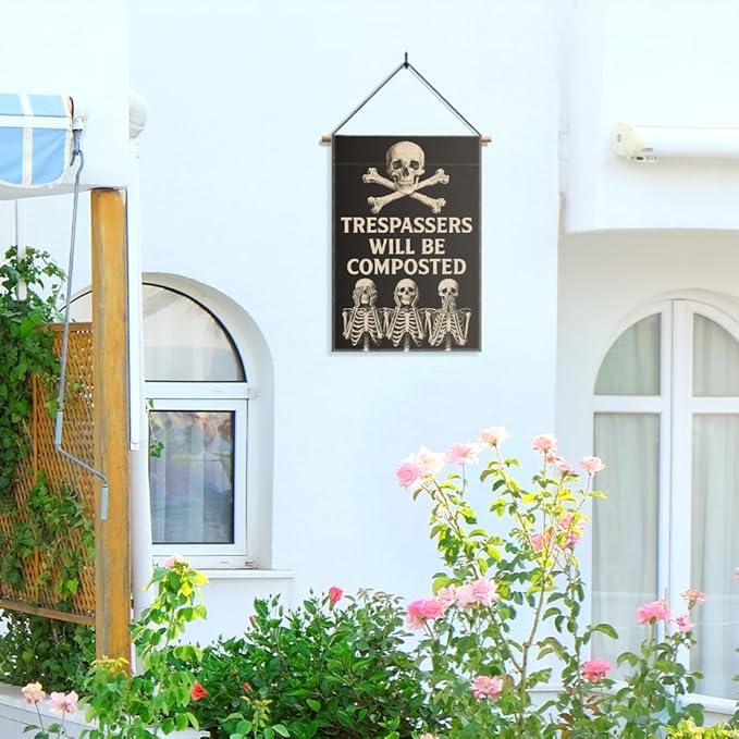 Trespassers Will Be Composted Garden Flag, Funny Skeleton Halloween Yard Sign for Outside, Skull Spooky Season Outdoor Porch Lawn Fall Decor, Plant Lover Gifts Gardener Halloween Banner